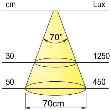 Au-dessus de la valeur de l'angle de diffusion, l'éclairement est réduit d'au moins la moitié de sa capacité.