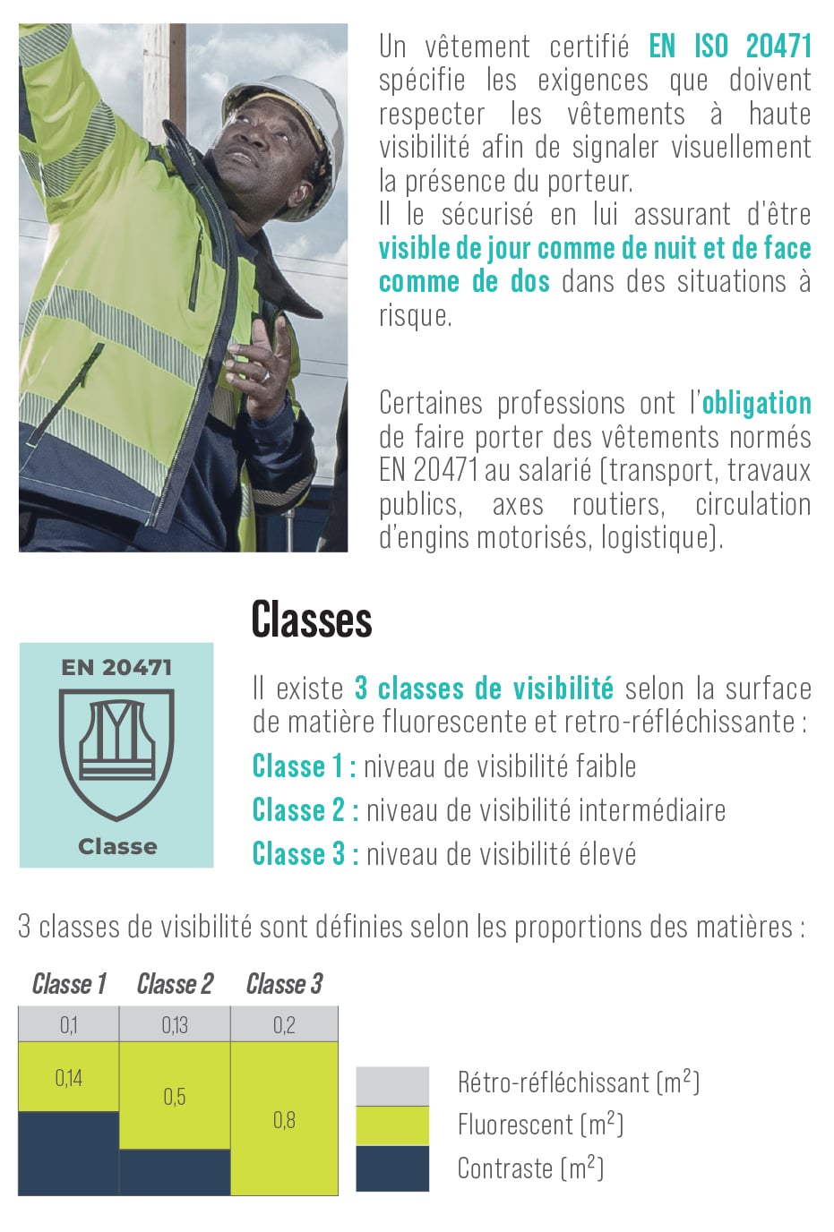 Elle spécifie des exigences de performance relatives à l’ergonomie, à l’innocuité, à la désignation des tailles, au vieillissement, à la compatibilité et au marquage des vêtements de protection ainsi qu’aux informations devant être fournies par le fabricant avec les vêtements de protection.