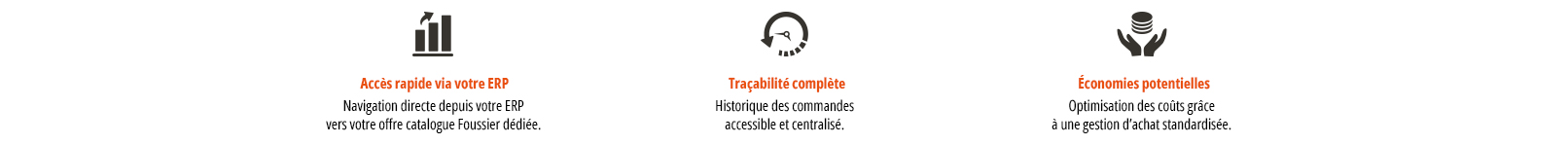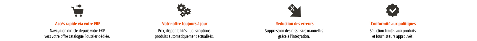 Profitez de tous les avantages de Foussier.fr avec vos conditions tarifaires, l’accès à vos stocks en temps réel et votre sélection de produits. Grâce à la connexion Punch-Out, commandez directement depuis votre système d’approvisionnement, sans ressaisie, pour un processus fluide et sécurisé.