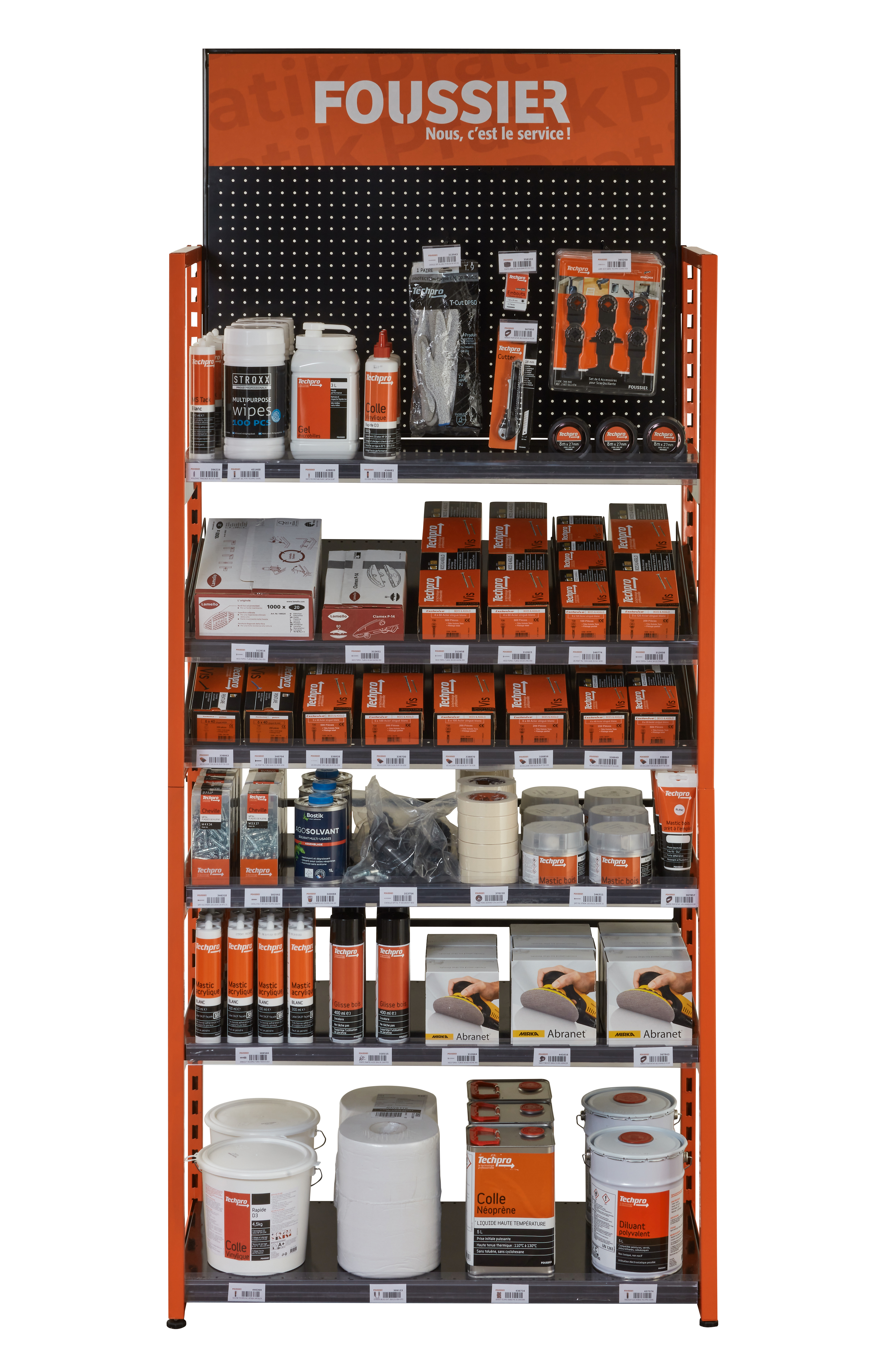 Rack modulable (code 443464) en kit composé de la structure principale (2 côtés orange / 1 structure de fond maintient / 1 support ajouré noir / 4 étagères droites / 2 étagères inclinées) et les accessoires (6 crochets simples / 6 crochets doubles / 6 supports étiquettes en bande plexi / 6 supports étiquettes petit format pour crochets / 8 petites clotures de séparation).